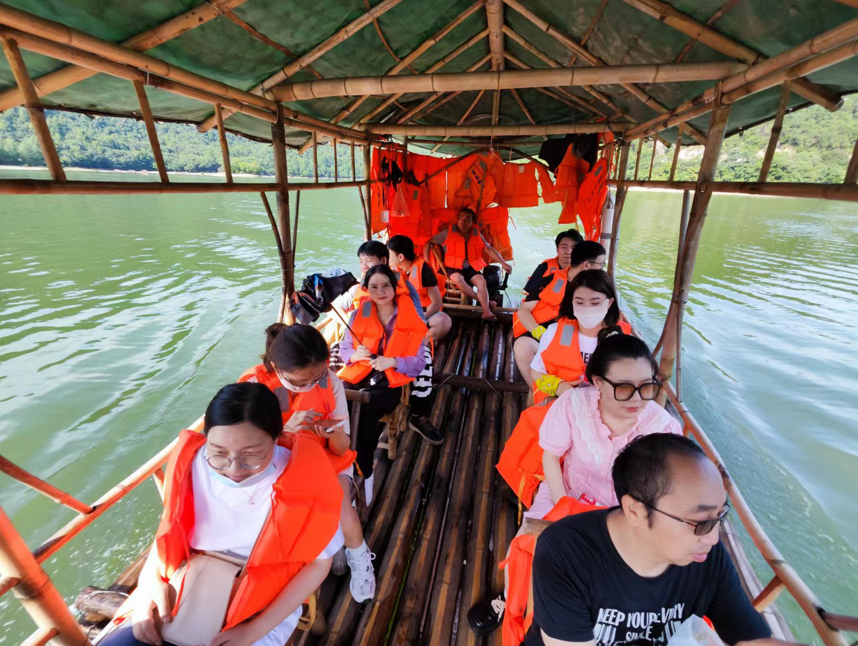 最后我們踩著滿山的綠意,一路游覽下山,坐上竹筏,在徐徐微風中,感受著“風軟竹筏穩,行依綠水堤”,愉快地結束了今天的愜意之行。