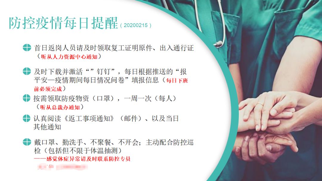 除了符合屬地政府針對復(fù)工“六到位”要求,和仁科技進(jìn)一步細(xì)化各項(xiàng)工作,例如:安排疫情防控專員,進(jìn)行防控物資統(tǒng)一分配登記、日常防控巡檢等,同時(shí)還通過公司職場各入口電視大屏,進(jìn)行“防控疫情每日提醒”等關(guān)鍵措施、注意事項(xiàng)提醒等。