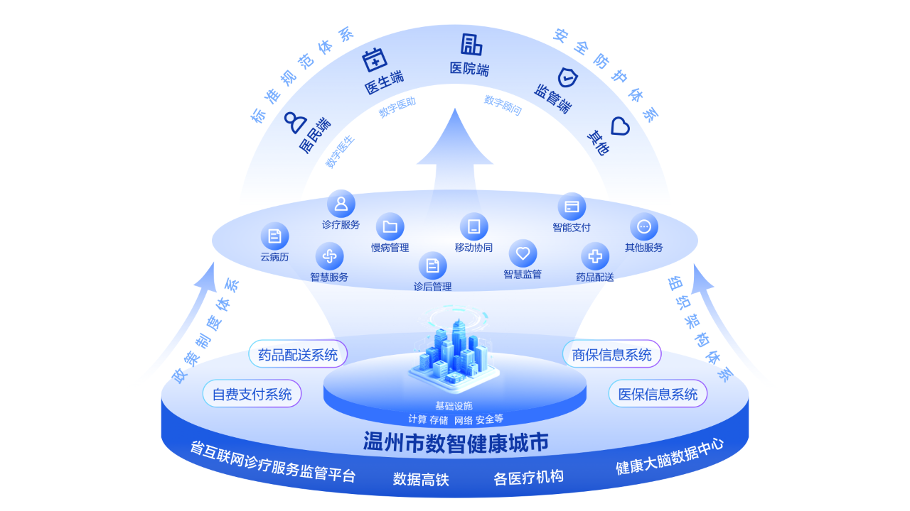全域數(shù)據(jù)互通體系:基于微服務(wù)架構(gòu)和容器化云部署,對(duì)接溫州市醫(yī)療健康數(shù)據(jù)高鐵,實(shí)現(xiàn)全市35家公立醫(yī)院HIS系統(tǒng)無縫對(duì)接,實(shí)時(shí)采集健康監(jiān)測(cè)、設(shè)備運(yùn)行等數(shù)據(jù),打破機(jī)構(gòu)間數(shù)據(jù)壁壘。同時(shí),整合合理用藥、電子簽章、處方流轉(zhuǎn)等系統(tǒng),形成“診療-審核-配送-結(jié)算”全閉環(huán)服務(wù)。