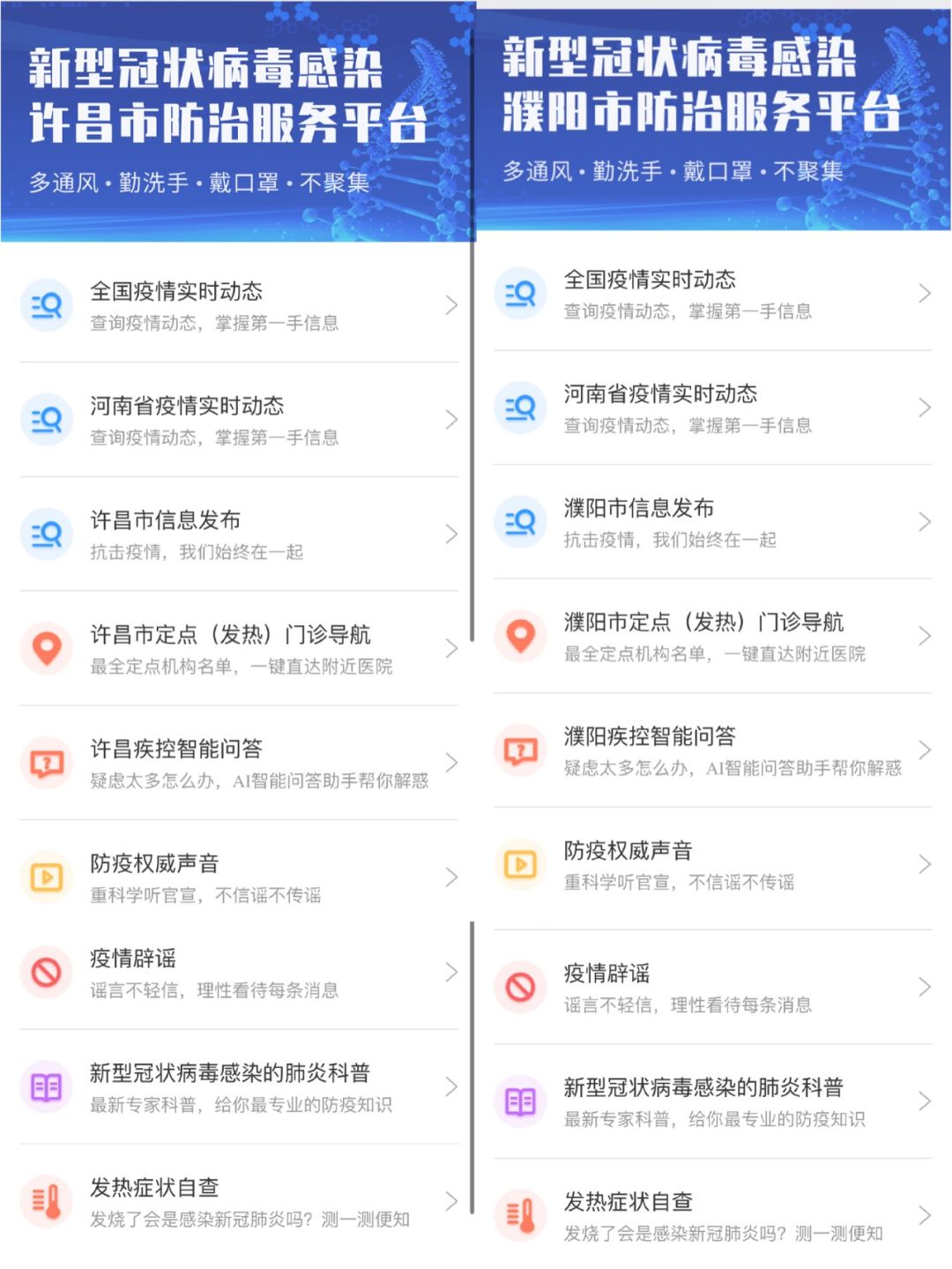 隨著防治服務(wù)平臺(tái)的正式上線,濮陽市、許昌市和延津縣居民可以隨時(shí)隨地通過手機(jī)在查看全國及河南省的疫情實(shí)時(shí)動(dòng)態(tài)、地方權(quán)威指令公告及全面防疫指南等信息的同時(shí),通過定點(diǎn)(發(fā)熱)門診導(dǎo)航、智能問答、防疫權(quán)威、疫情辟謠、防疫科普等板塊的設(shè)置,讓居民可以不信謠、不恐慌,正確認(rèn)識(shí)疫情,堅(jiān)定共同戰(zhàn)勝疫情的決心。