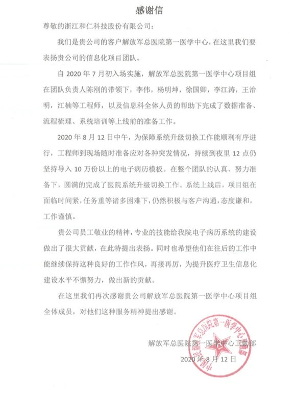 近期, 浙江和仁科技股份有限公司(以下簡稱“和仁科技”)收到了來自中國人民解放軍總醫院第一醫學中心的感謝信,表揚了和仁科技的專業能力及在項目實施過程中的敬業精神。