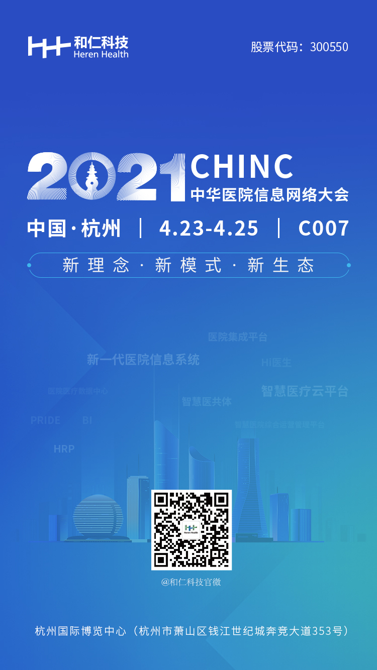 由國家衛生健康委醫院管理研究所主辦、《中國數字醫學》雜志社承辦的“2021中華醫院信息網絡大會(CHINC)”將于4月23日-25日在杭州盛大開幕。和仁科技(展位號:C007)作為智慧醫療整體解決方案服務商致力于用科技力量助力智慧醫療發展,將攜旗下核心產品亮相本次大會,屆時期待您的蒞臨。